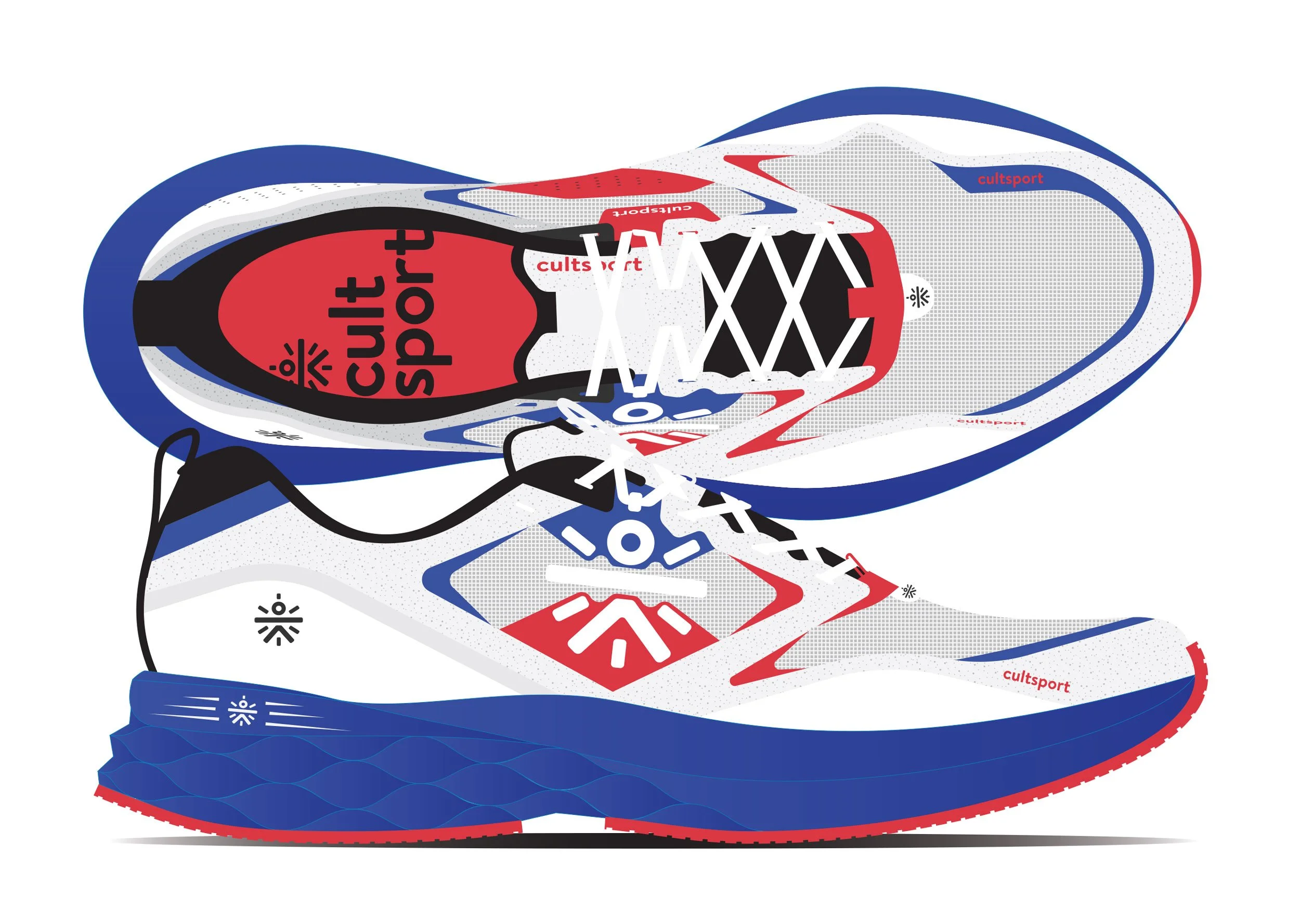For this 5th running shoe silhouette for Cult.Fit India my design approach is 90’s retro inspired. A no-sew construction is used to omit stitching. I am applying layering to create design interests on the upper, for example, the lateral and medial forefoot mud guard pieces are fused over the toe cap piece. The same applies to the heel counter which the overlay piece is fused on top of a stiffer heel counter material. The V-Man brand logo is cased within quarter area which has its own layering details.